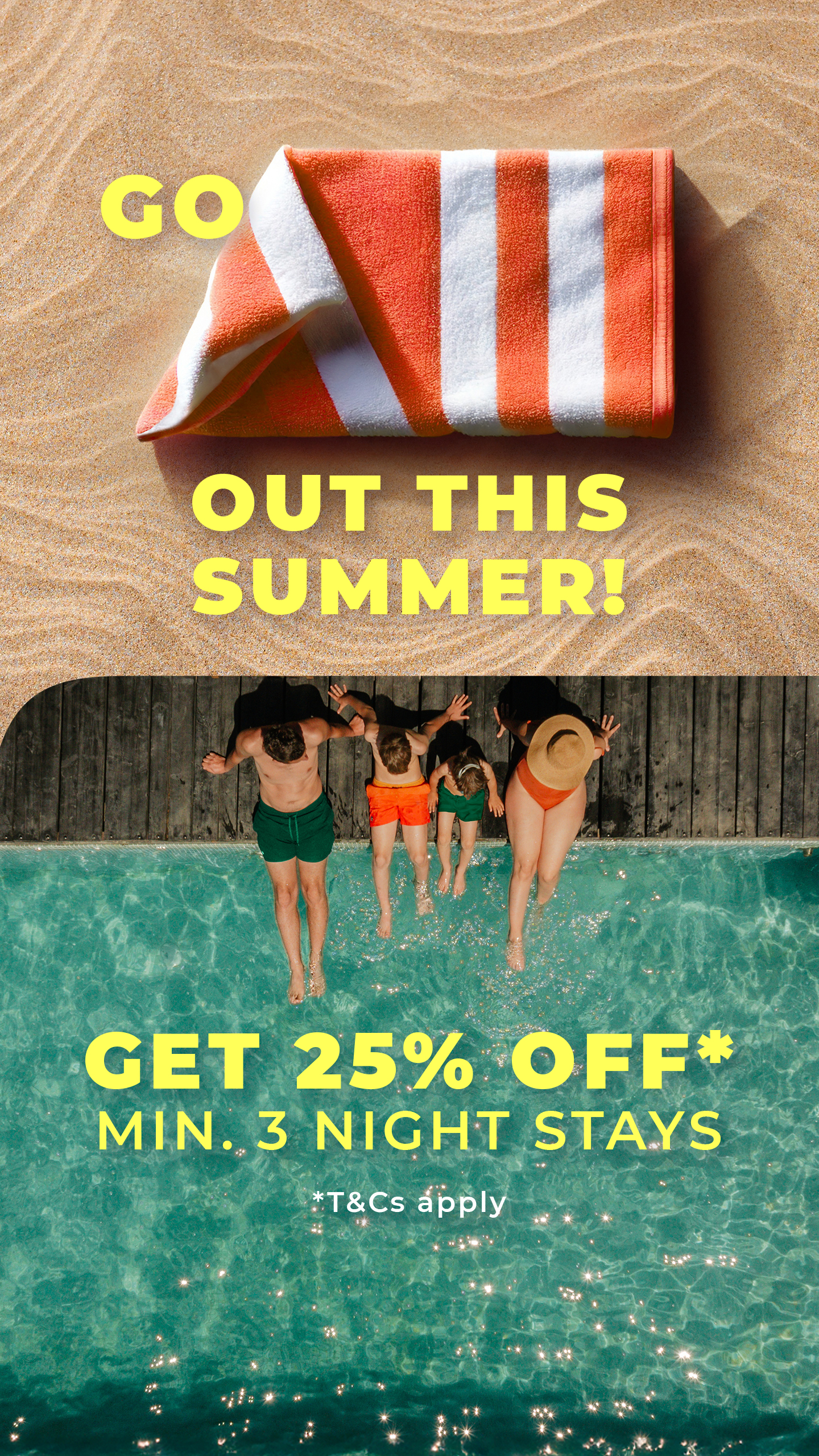 The towel visual is paired with warm, authentic imagery of a family enjoying time by the pool, grounding the concept in real moments of summer togetherness. Complemented by inspiring destination and hotel visuals, the campaign tells a complete story of summer escapes where every detail invites guests to be all out for summer.
